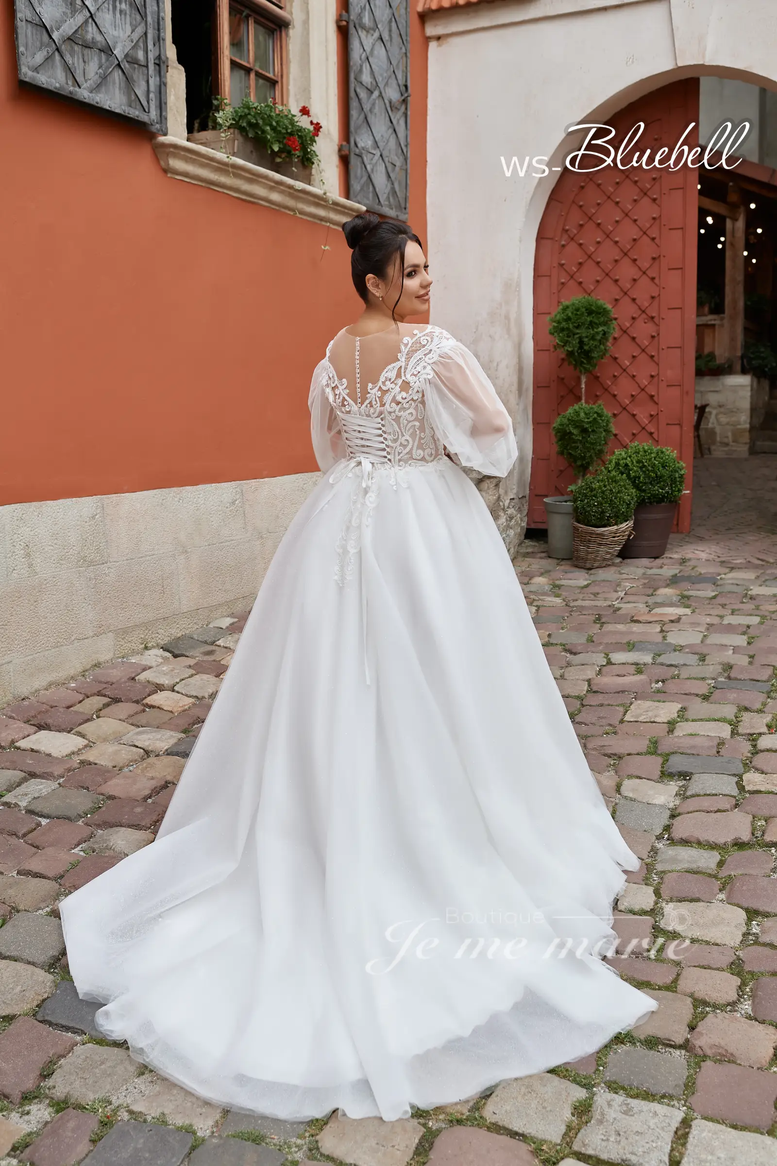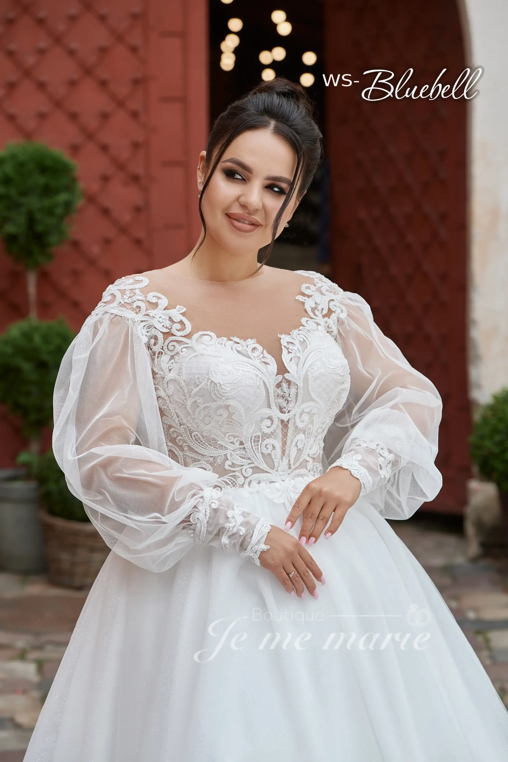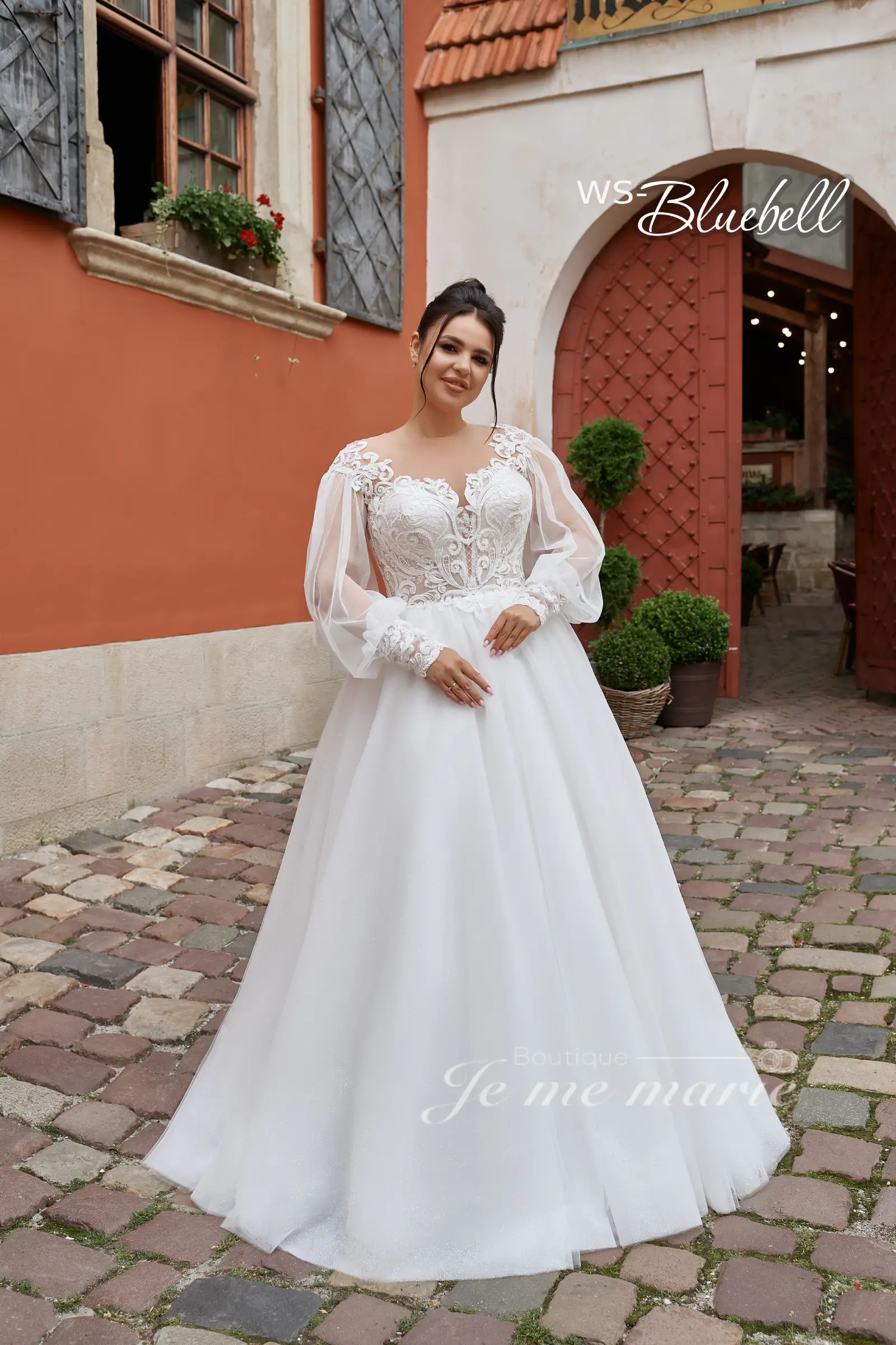 Robe de mariée WS-Bleubell à silhouette en A style princesse avec dentelle et perles sur le corset. Manches longues bouffantes avec poignets. Dos avec lacets, boutons et fermeture éclair. Jupe en tulle brillant. **Veuillez suivre la charte des mesures pour vous assurer de sélectionner la bonne taille.**