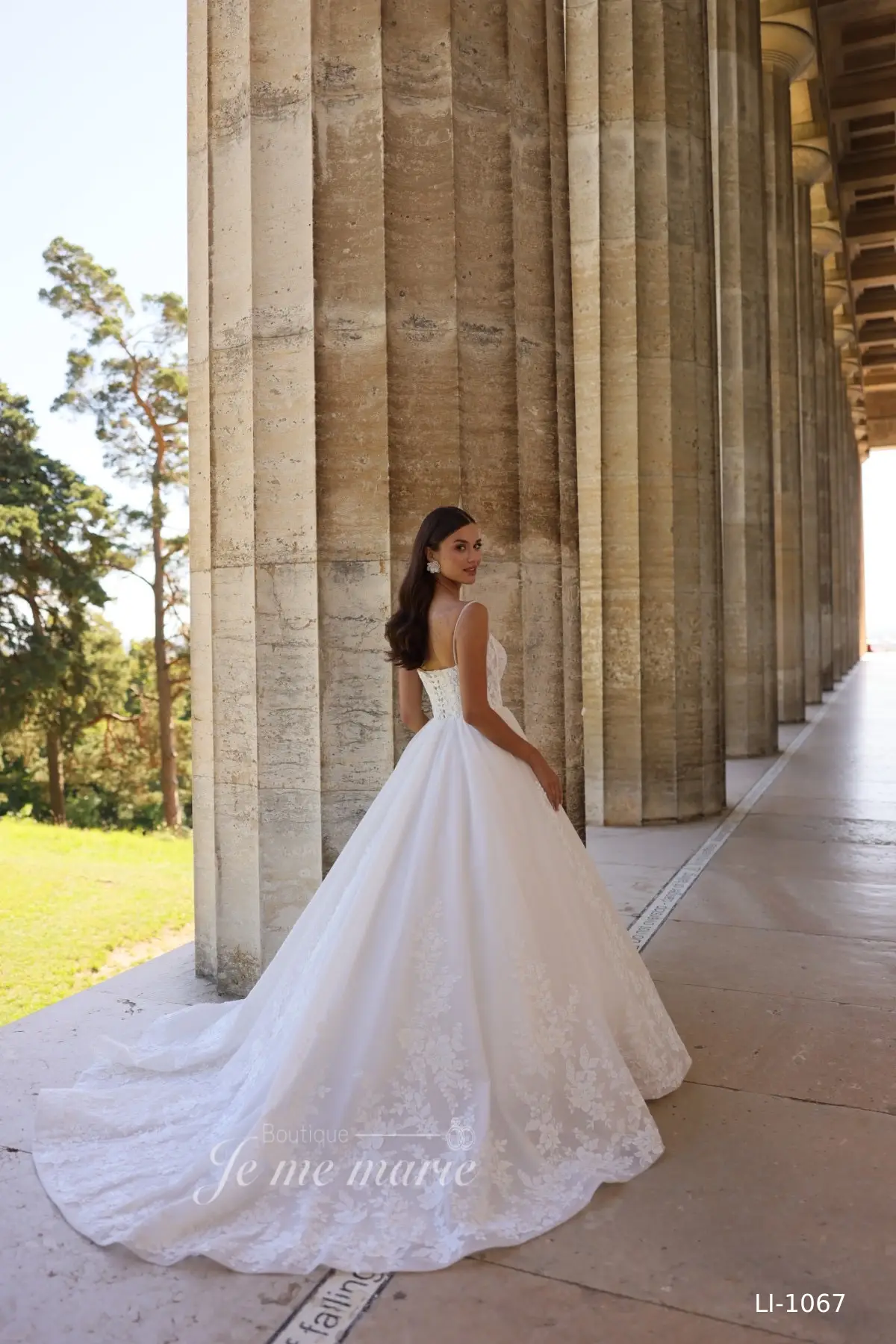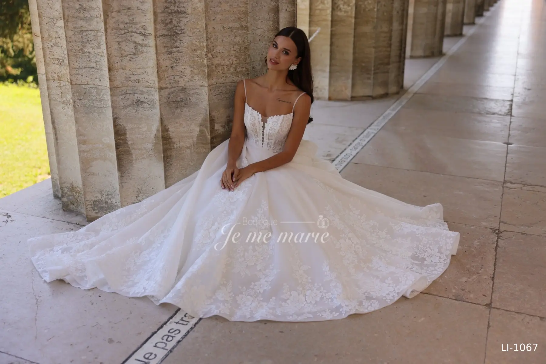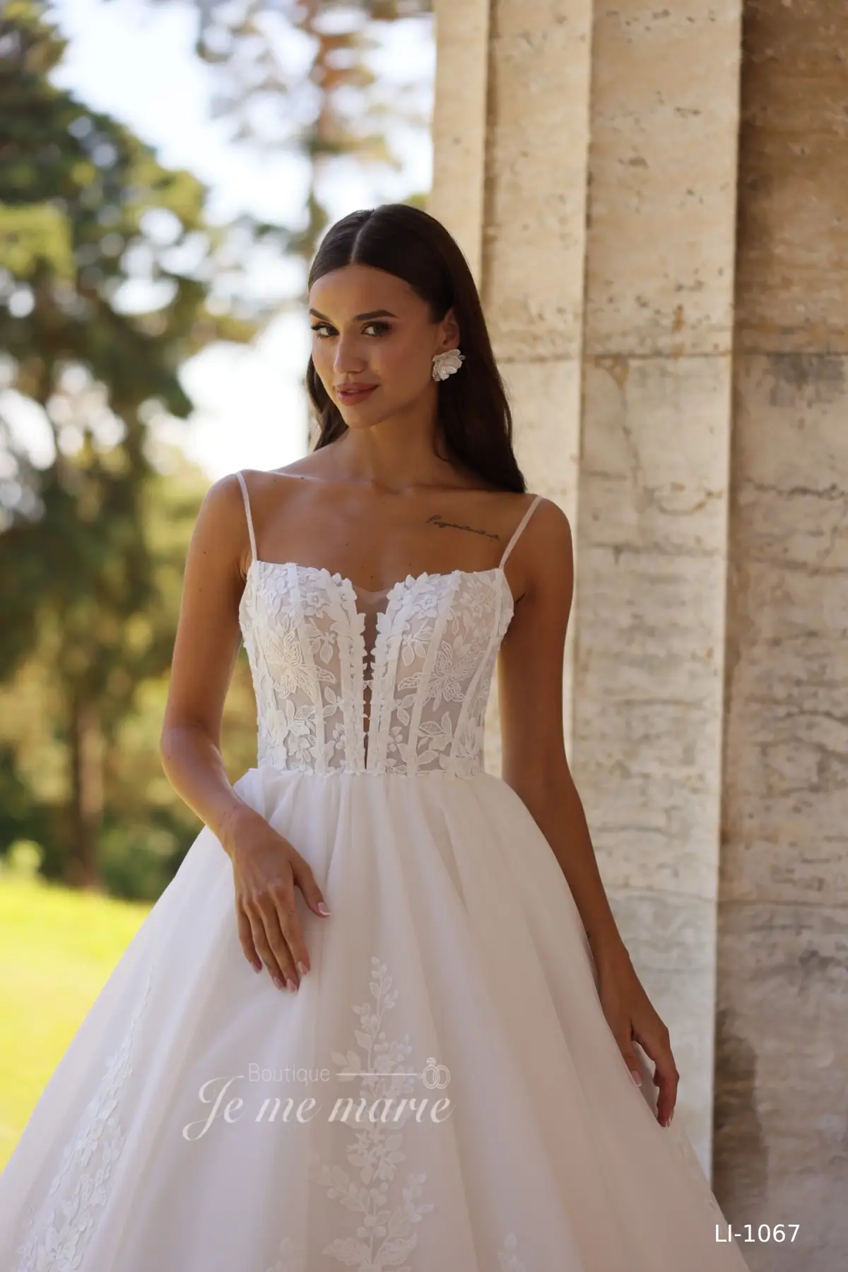 Robe de mariée LI-1067 A-line ligne A avec dentelle et bretelles spaghettis.