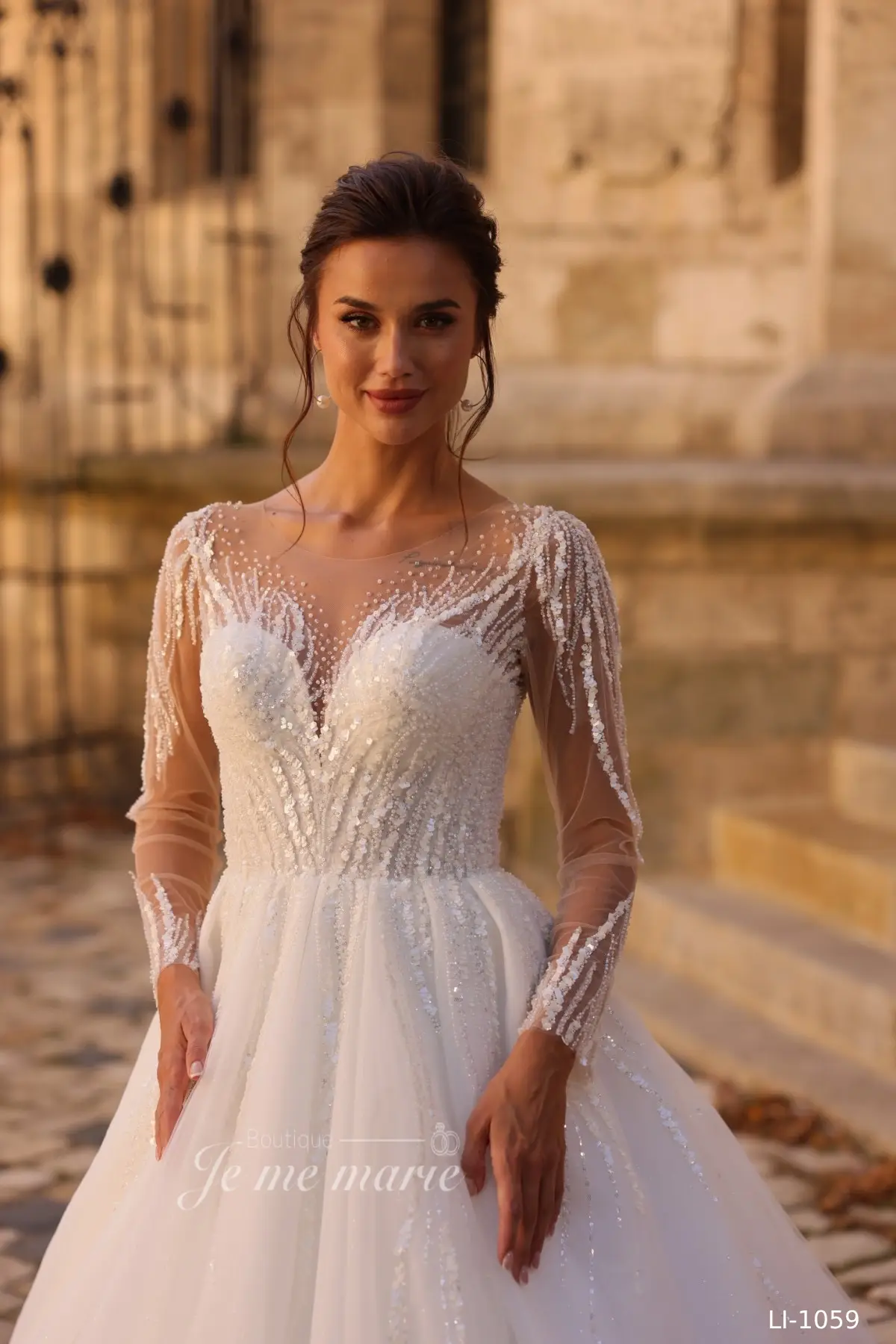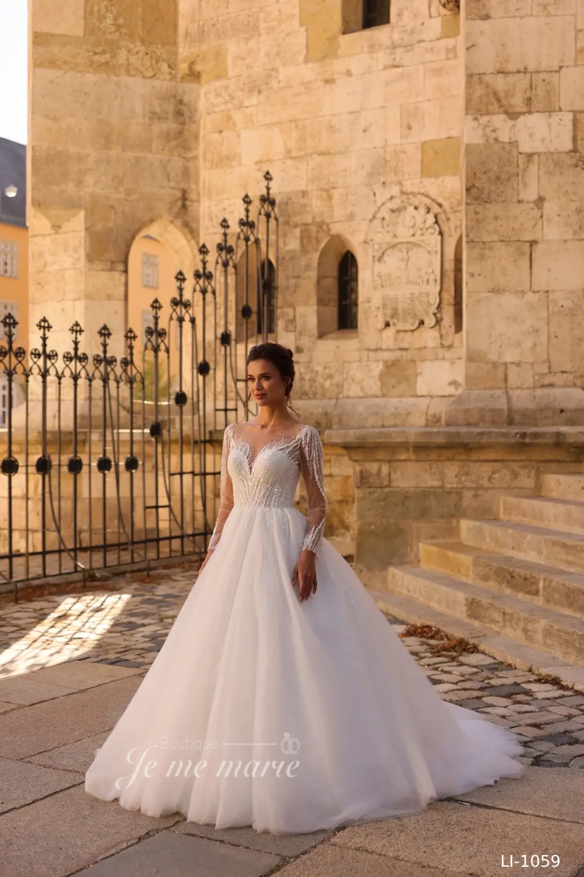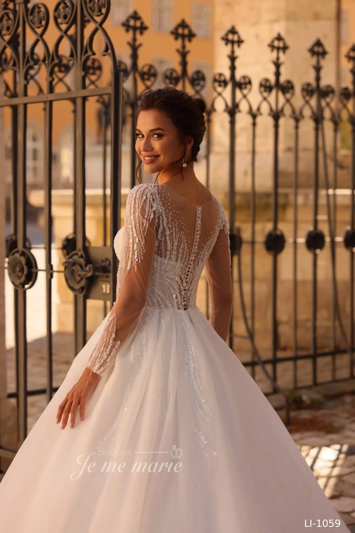 Robe de mariée LI-1059 en tulle avec manches longues en dentelle.