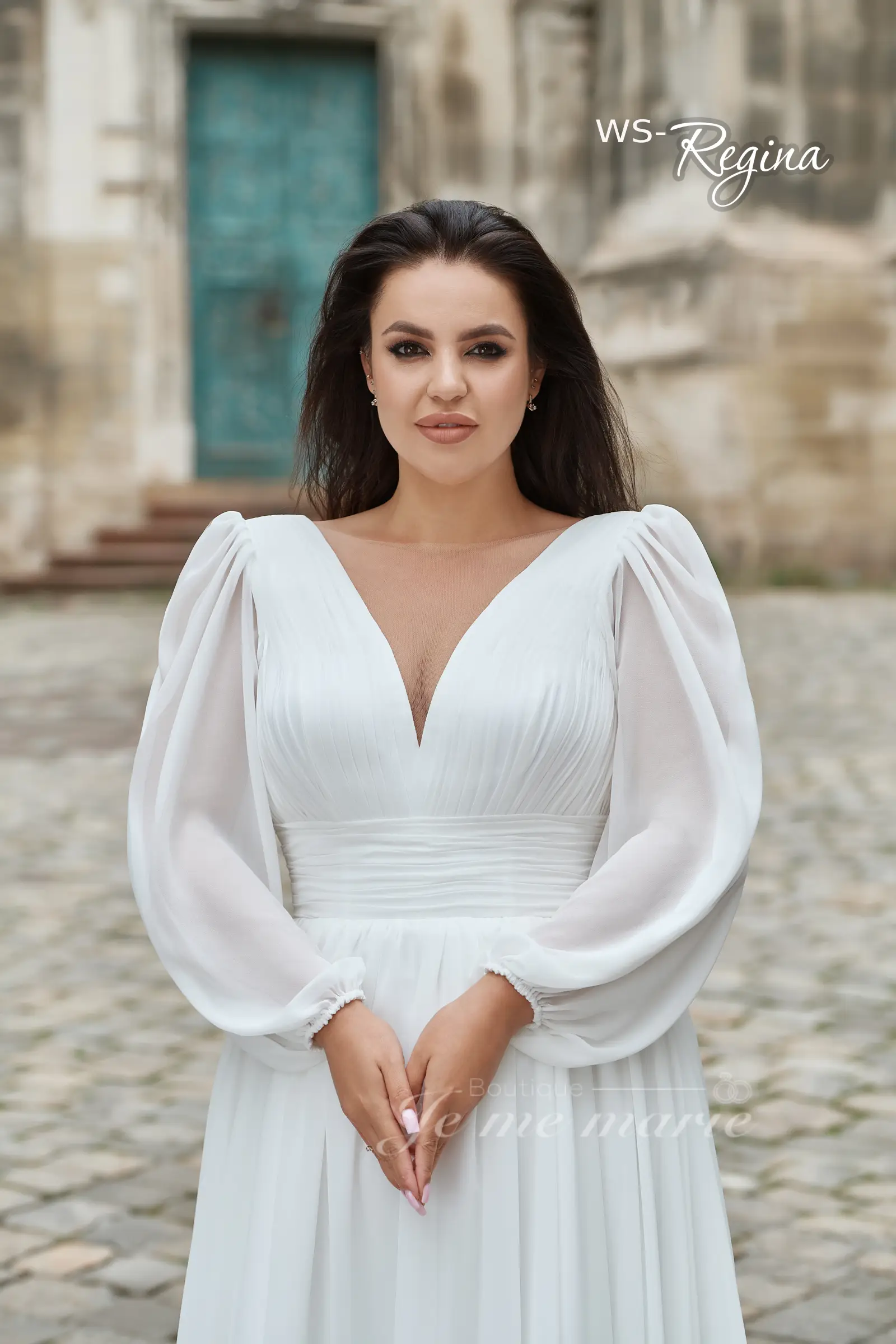 & Livraison accéléré disponibleRobe de mariée WS-Regina en minimaliste en chiffon avec manches et col plongeant pour idéal pour mariage extérieur. ** Veuillez consultez la charte des mesures pour faire votre choix.**